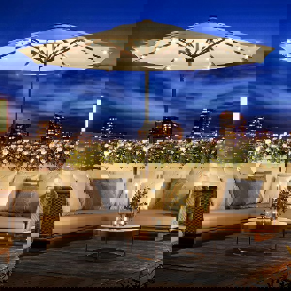 Enjoy sunny days and cool evenings with this 3M LED solar-powered garden parasol, designed for patios, gardens, and outdoor dining spaces. This large outdoor umbrella features a solar panel at the top, which powers 24 LED lights along the ribs for 6-8 hours, ensuring ambient lighting for nighttime relaxation.