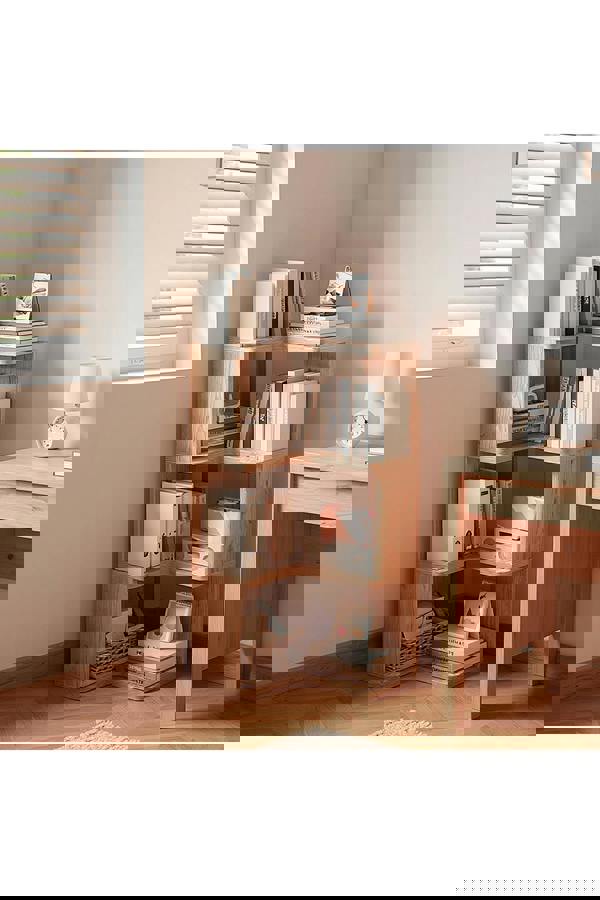 Let this L-shaped corner bookshelf enhance your living space. It showcases a warm and cosy atmosphere with its natural wood colour, blending seamlessly into various home decor styles. The muti-tier large-capacity design provides ample storage space, easily accommodating books, decorations, potted plants, and more. The open storage design ensures that books are clearly visible, making daily retrieval more convenient. The side panels on both ends help prevent items from falling off, while the wide base ensures stability by increasing the force-bearing area. Suitable for the living room, bedroom, or study, it is an ideal choice that combines beauty with functionality.
