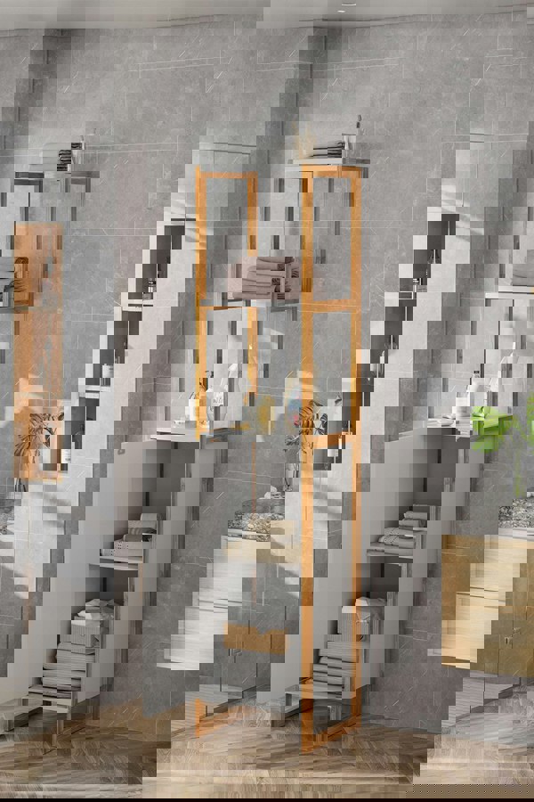 This single-door tall bathroom storage cabinet enhances the bathroom storage experience with a simple design. The two-layer open shelves on the top provide ventilation and are perfect for storing toiletries or decorative ornaments for easy access. The cabinet below is equipped with two-layer shelves inside, which effectively expands the storage space and helps you easily organize towels, bath towels and other items, keeping the bathroom tidy and orderly. This cabinet optimizes the storage needs of small spaces while adding a touch of modern elegance to the bathroom.