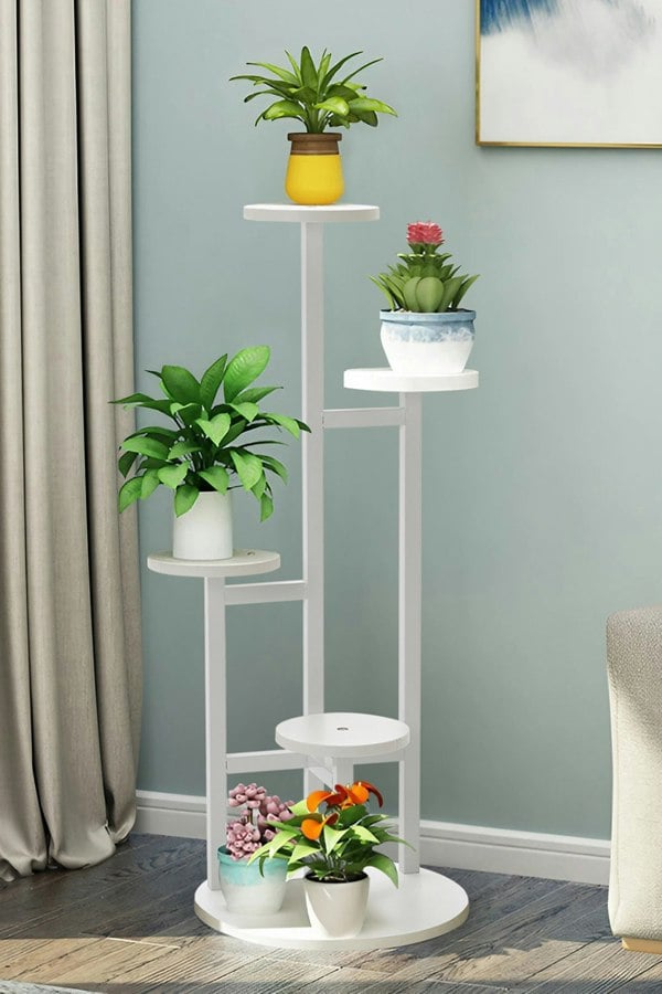 This Livingandhome tiered plant stand helps you create a forest indoors. Designed with shelves of different heights, an exquisite display of your favourite plants can be achieved effortlessly. What is more, the varying heights are also beneficial for the growth of your greenery because in this way they can acquire sufficient sunlight. The plant stand adopts iron and MDF as the major materials, which makes for a durable addition.