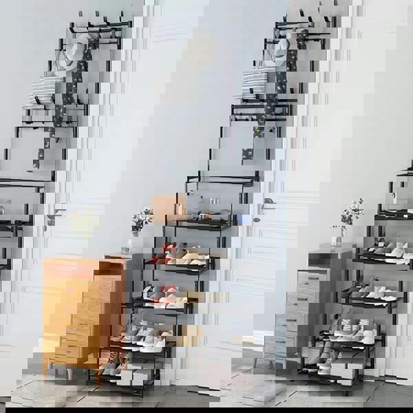 Keep your entryway tidy with this clever shoe rack and coat hanger! The 5-tier design offers plenty of storage for shoes and other items, keeping your home clutter-free. The double-row hooks are perfect for hanging coats, hats, and bags, all within easy reach. It is easy to assemble and lightweight, so you can move it around to suit your needs. Ideal for bedrooms to store clothes and shoes, or in your living room as a stylish and practical piece of furniture. Perfect for keeping hallways and entryways organised!