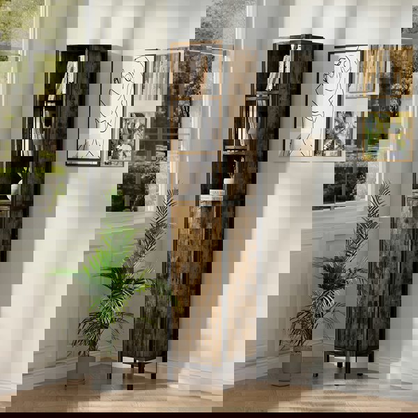 Introducing our tall storage cabinet, a perfect blend of style and practicality. Crafted from eco-friendly MDF and supported by durable metal feet, it is both sturdy and long-lasting. With a convenient metal finger pull, the door below opens effortlessly, providing easy access to your items. Designed with a magnetic catch, it ensures that the door is dust-free and prevents accidental opening. Furthermore, three semi-open compartments provide convenient accessibility to meet your storage needs, while two concealed shelves behind the door add privacy, keeping items clean and dry.