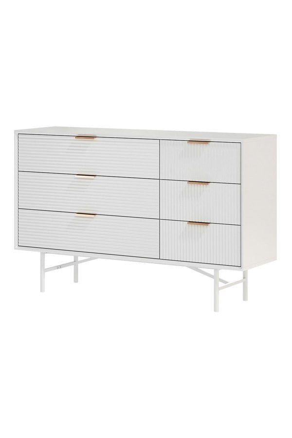 White storage cabinet with three-dimensional stripes is a stunning product that features a modern stylish design. It features six spacious drawers, perfect for organizing clothes, scarves, and accessories. Supported by a sturdy base with a clean finish and adorned with elegant gold handles, this cabinet adds a touch of sophistication and style to your space.