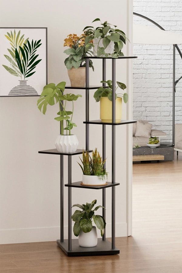 This plant stand combines modern minimalist design with exceptional functionality, elevating the aesthetic of your home while maximizing practicality. With an asymmetrical layer design, its upright structure can perfectly fit into the corner of your house, saving space and ensuring ample sunlight for even low-growing plants through its staggered layers. Each MDF shelf offers generous space, perfect for showcasing potted plants, books, ornaments, and more, blending effortlessly with any decor. The sturdy base ensures stability and safety, while the smooth, easy-to-clean surface keeps the plant stand looking sleek and polished.