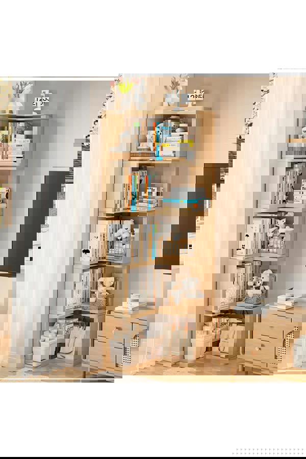 Let this L-shaped corner bookshelf enhance your living space. It showcases a warm and cosy atmosphere with its natural wood colour, blending seamlessly into various home decor styles. The muti-tier large-capacity design provides ample storage space, easily accommodating books, decorations, potted plants, and more. The open storage design ensures that books are clearly visible, making daily retrieval more convenient. The side panels on both ends help prevent items from falling off, while the wide base ensures stability by increasing the force-bearing area. Suitable for the living room, bedroom, or study, it is an ideal choice that combines beauty with functionality.