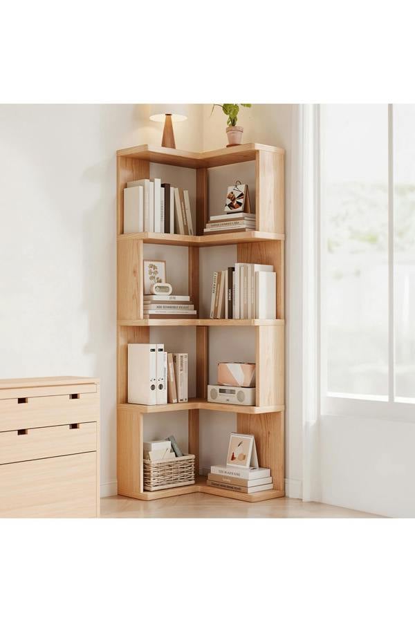 Let this L-shaped corner bookshelf enhance your living space. It showcases a warm and cosy atmosphere with its natural wood colour, blending seamlessly into various home decor styles. The muti-tier large-capacity design provides ample storage space, easily accommodating books, decorations, potted plants, and more. The open storage design ensures that books are clearly visible, making daily retrieval more convenient. The side panels on both ends help prevent items from falling off, while the wide base ensures stability by increasing the force-bearing area. Suitable for the living room, bedroom, or study, it is an ideal choice that combines beauty with functionality.