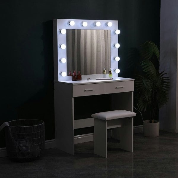The mirror is generously sized and embellished with 12 light bulbs around the rim, providing ample illumination for a professional makeup setup. What is more, there are two drawers that can offer storage for your makeup and skincare, keeping them organized and easily accessible while the tabletop can stay clutter-free and organized. This dressing table set features a large Hollywood-style mirror atop a stable tabletop, creating your own beauty sanctuary right in your bedroom. The set also includes a padded stool, enhancing comfort during makeup application sessions.