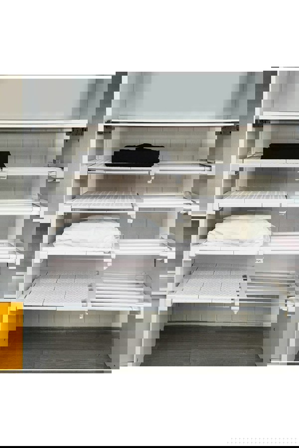 The shelf divider can be automatically retracted to adjust to your desired length, without the need to touch nails, or jam, stealth. Easy to install. A movable anti-slip leak-proof plate for storing small objects. There is no leak-proof board, which can be used to hang clothes, scarves, belts, etc. No holes and screws required. Widely used in any wardrobe, closet, cupboard or anywhere in the house where you want to create extra space to put more things.
