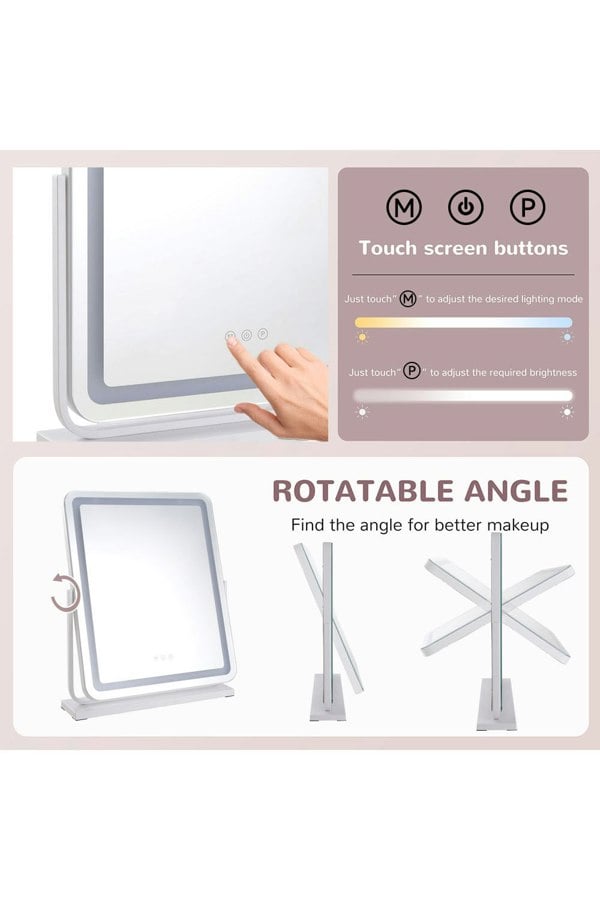 Complete flawless makeup with this lighted vanity mirror. The mirror features a gorgeous frameless design that presents a large mirrored surface with high-definition glass. It is built in with energy-efficient LED lights that you can adjust the colour temperature and brightness. Switch between 3-light modes (warm, natural and cold) via the touch control sensor. Also, the mirror is 360° rotatory, so you can tilt it to get the perfect angle.