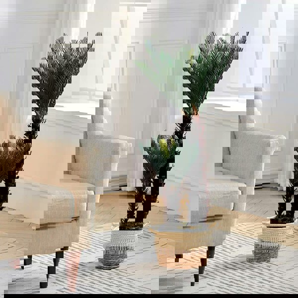 Standing 90cm tall, our 2-head fake palm tree is perfect to be settled in any area of your room. With its leafy fronds extending upward and outward from big and thick trunks, this tropical plant can bring a lively tropical touch to your home. The plant comes in a black pot, you can replace it with other planters that can represent your personal taste if you like, so this artificial plant can be your one of a kind decoration.