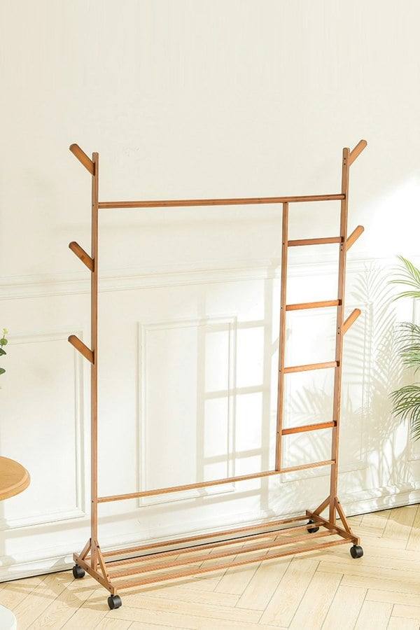 Equipped with a top rod and bottom shelf, clothes stand gives you more storage options. The top rod provides sufficient space to hang long pants, overcoats, and dresses. The slatted bottom shelf is made of premium bamboo, and provides a great bearing capacity. The well-polished surface helps prevent any possible scratches for the safety of your family. Built to be versatile, it can be settled in a hallway, bedroom, or living room as you wish.