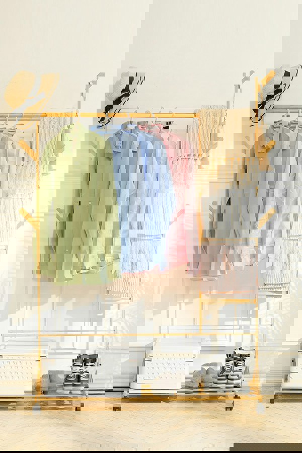 Equipped with a top rod and bottom shelf, Livingandhome clothes stand gives you more storage options. The top rod provides sufficient space to hang long pants, overcoats, and dresses. The slatted bottom shelf is made of premium bamboo, and provides a great bearing capacity. The well-polished surface helps prevent any possible scratches for the safety of your family. Built to be versatile, it can be settled in a hallway, bedroom, or living room as you wish.