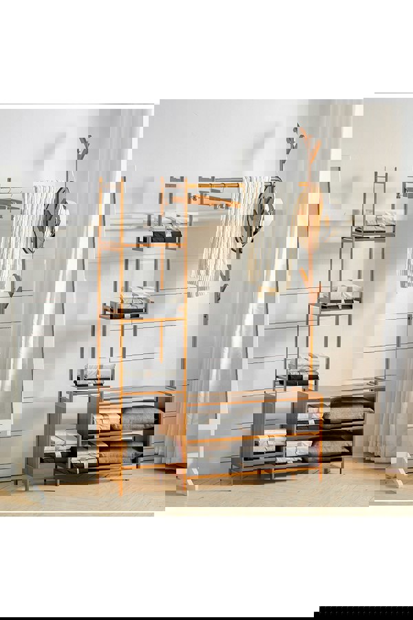 Our Livingandhome multifunctional free-standing clothing rack affords practical storage space. With a 4-tiered side shelving, a coat tree, a hanging rod, and a 2-tier shoe rack, this clothes rack does an excellent job of keeping your items organized. From your coats, backpacks and shoes, to hats, you’ll always find an ideal way to store them. It has a simple and modern appearance with its clean silhouette and natural finish.