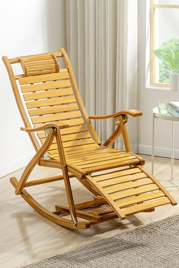 Relax in comfort with this bamboo rocking chair. Made from thickened bamboo and premium hardware, this lounge chair is the epitome of quality and sustainability. Designed with ergonomics in mind, the chair features a built-in headrest and a retractable massage footrest to ensure a comfortable sitting experience. Plus, it comes with widened armrests for enhanced relaxation, making it perfect for patios, gardens, backyards and balconies.