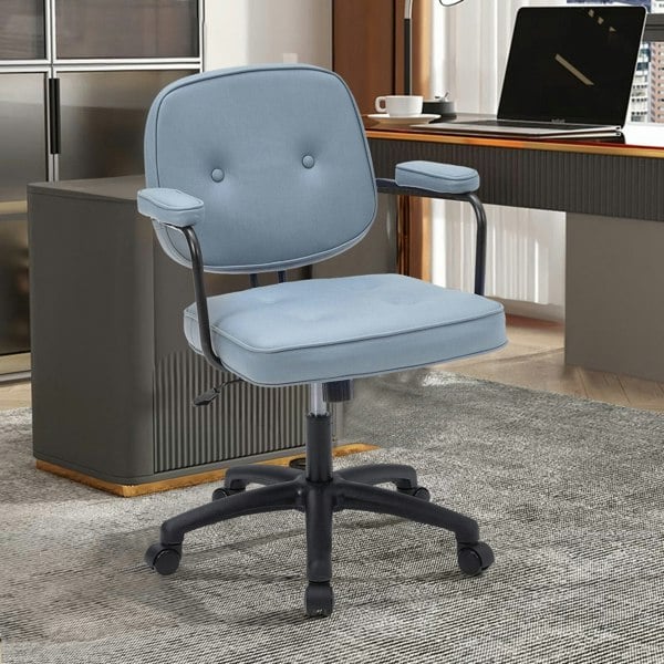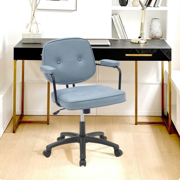 Enhance your workspace with the Blue Upholstered Office Chair with Armrests and Rolling Wheels. This chair combines modern aesthetics with practical functionality, featuring a comfortable design upholstered in durable tech fabric. The armrests, backrest, and seat cushion are detachable, allowing you to customize your seating experience. Filled with high-quality sponge, the chair provides a plush and supportive seating surface. The rolling wheels and adjustable height make it perfect for both home and office use, providing ease of movement and ergonomic comfort