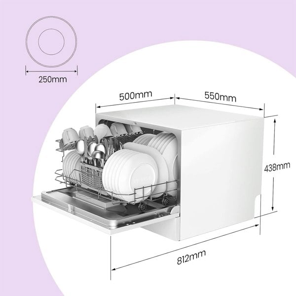 Designed for efficiency, it accommodates up to 6 place settings—perfect for 2-3 people. Its flexible racking system ensures that even larger plates up to 250mm fit with ease. With 6 washing cycles, including an ECO mode that uses just 6. 5L of water per cycle, this dishwasher saves water and energy compared to handwashing. The intuitive LED display and user-friendly controls make selecting your desired function simple, while indicators ensure you never forget to refill rinse aid or salt for optimal performance.