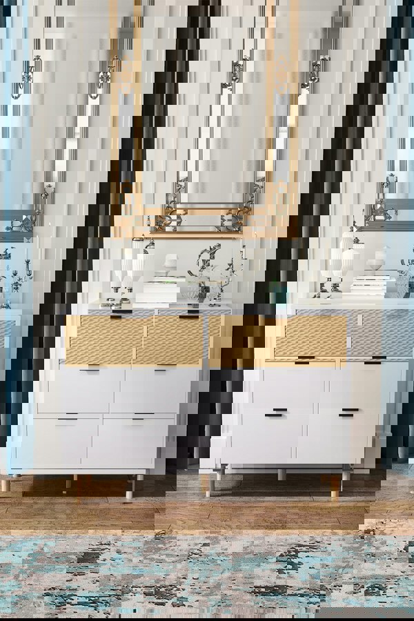 This Livingandhome chic storage cabinet recalls the sophistication of modern-inspired home interior with its pared-down design. The clean white finish, complemented by the unique patterns on the top drawers, creates a visually appealing and versatile addition to contemporary any home setting. Equipped with six generously sized drawers, the cabinet stands firmly on five white tapered legs, elevating it to a convenient height, allowing you to effortlessly reach every spot of the floor during cleanup.