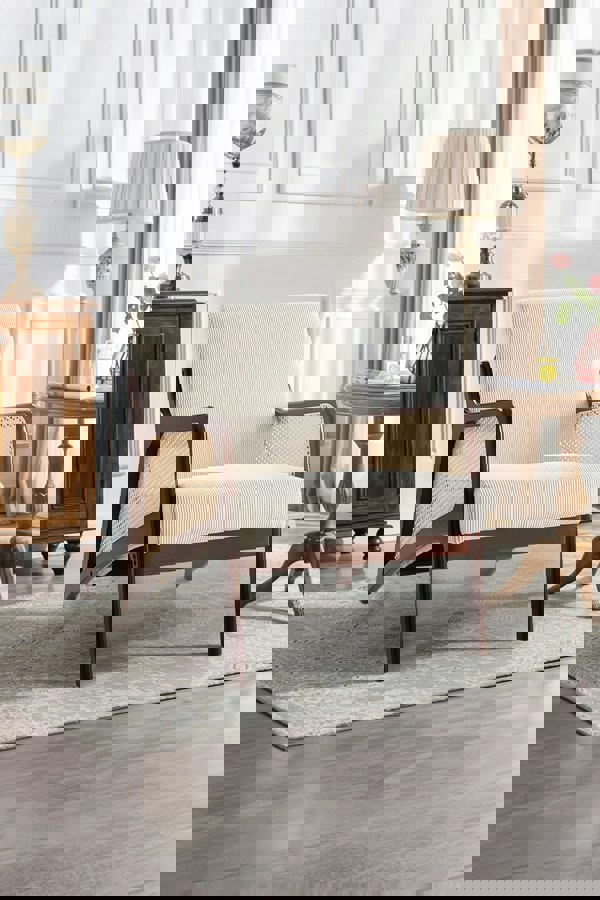 Whether you are going to read a book, or play some video games, this armchair is the most comfy choice to sit on and enjoy your me time. The luxurious corduroy fabric not only gives this armchair a classy look but also promises that it is lavishly comfy. The rubberwood legs provide sturdy support, while the rattan design on both sides of the armrests adds a touch of uniqueness. Ideal for relaxing after a long day, this armchair is a beautiful addition to any living space.