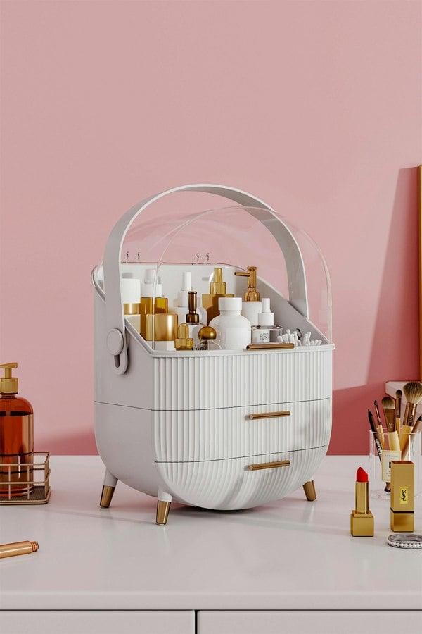 Here comes a good helper with your makeup organization and arrangement. Designed with a cabinet and 2 drawers, your tall bottles, makeup brushes can fit in perfectly. Rest assured that 70% of your tabletop space can be saved. It adopts thickened plastic and acrylic, so it’s scratch-resistant, your items will stay well-protected in it. Settle it on your desktop, both as an organizer and a modern decorative piece.