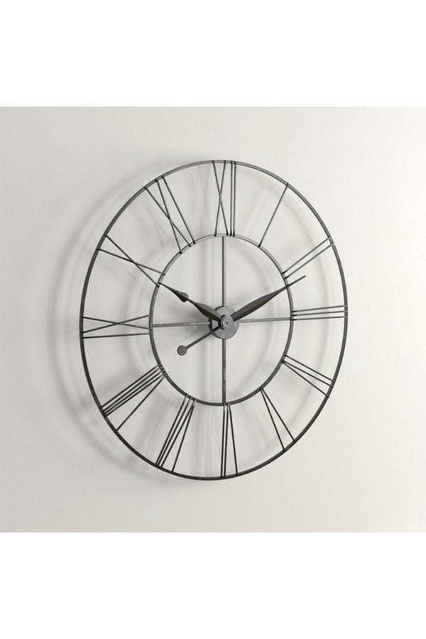 This wall clock features slender Roman numerals, which go well with the metal construction just fine.