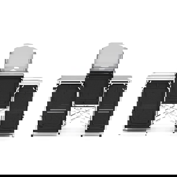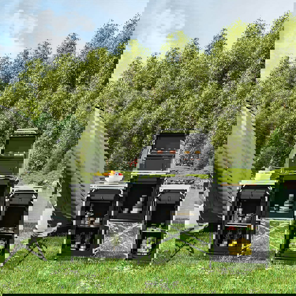 Combine all the comforts of home with the romance of an outdoor campfire with this robust camping kitchen. Your outdoor kitchen will be ready in just a few minutes, thanks to its folding and locking functionality.