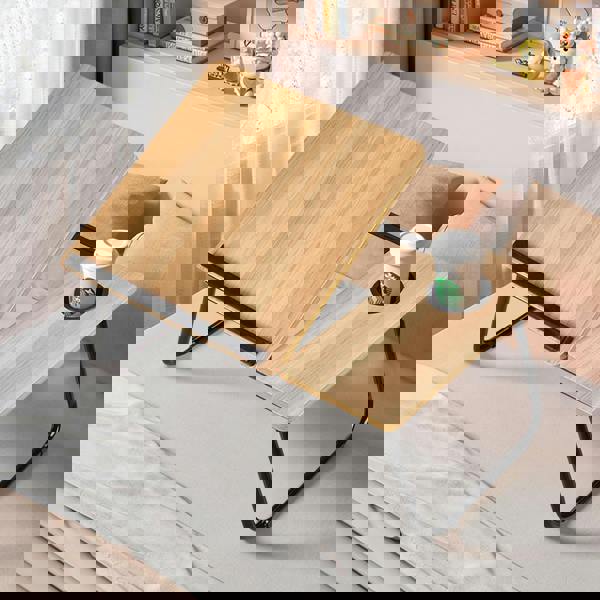 This bed table is ingeniously designed, featuring a spacious surface that provides ample room for your laptop and office supplies. The five-level adjustable desktop design allows you to set it to the most comfortable angle according to your personal needs. It is also equipped with an anti-slip bar that effectively prevents items from sliding off. Underneath the table, there is plenty of space for leg movement without any restrictions. Additionally, the support legs are constructed with a stable trapezoidal structure and come with non-slip foot pads to ensure the desk remains steady and secure.