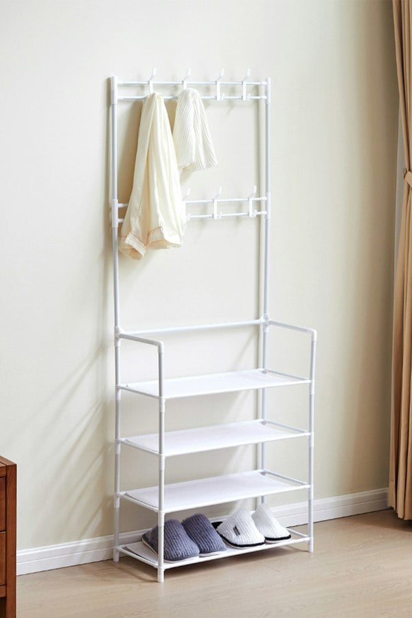 Make the most of your entryway space with this efficient shoe rack and coat hanger combo from Livingandhome. This clean linear shoe rack applies a quality framework for competitive durability and strength. This is a multifunctional freestanding rack that provides vertical storage for small-space living. The upper dual hooks keep your bags, hats, coats, keys, and dog leashes handy and tidy, and there are 4 tiers of shelves where you can store shoes and baskets.