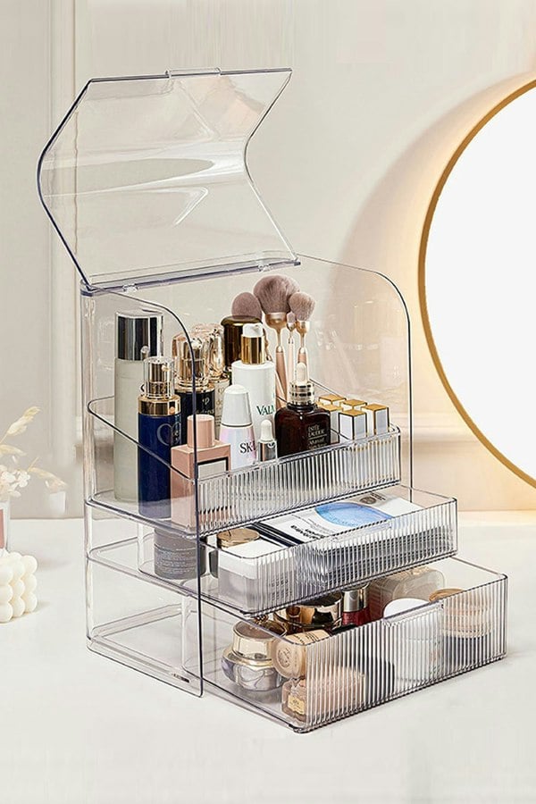Made of durable and long-lasting transparent acrylic, curved top cover protect your skincare products and cosmetics from water and dust, keeps them tidy and clean, you don’t need to worry about putting it in the bathroom, easy to keep up with your daily.