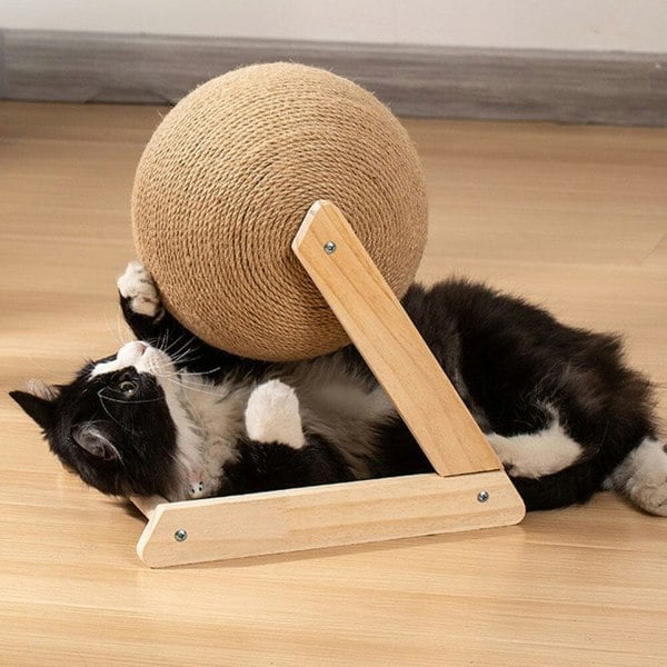 This wooden cat scratcher toy features a V-shaped design that provides an engaging and functional space for your feline friends to play and sharpen their claws. Crafted from high-quality solid wood and wrapped in durable sisal rope, this scratch ball promotes healthy scratching behavior while keeping your furniture safe. Its compact size makes it an ideal addition to any home, ensuring hours of entertainment for your cat.