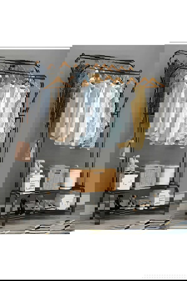 Show your taste and turn your wardrobe into a stylish display with this clothes rack. Designed for clothing collectors, the double-rod construction accommodates an ample amount of clothes without feeling crowded. The two-layer rack offers a perfect display stand for storage boxes and shoes, allowing you to neatly place them together with your clothes. This clothes rack makes it convenient to match your daily outfit in front of a full-length mirror. Crafted from sturdy metal with an anti-rust and anti-corrosion coating, this rack is both stable and durable.