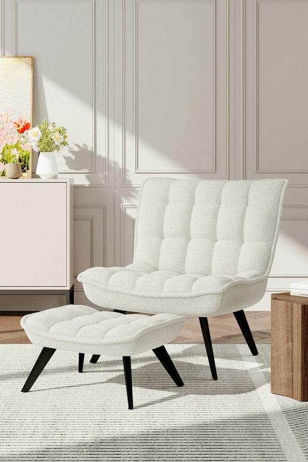This Chair with Footstool is the perfect combination of comfort and style. With its velvet-wrapped seat and super-soft sponge filling of this chair can afford the kind of coziness you have been craving. The accompanying footstool not only lets you kick your feet up for complete relaxation but also doubles as an additional seating option. Whether you are furnishing your living room, creating a cozy reading corner, or adding comfort to any relaxation area, this set seamlessly integrates into your space. This item requires assembly