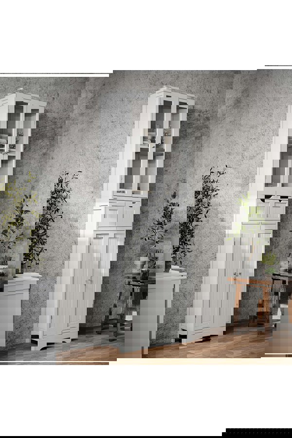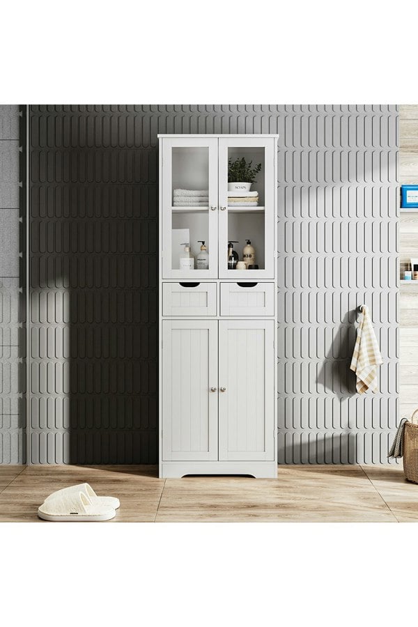 With a sleek white finish and tall design, this glass door cabinet opens up the storage in your home. Two cabinets bring out the combination of open and closed storage--the glass door cabinet allows you to see the items inside without having to open the door, while the cabinet below keeps your daily necessities well hidden. What is more, two small drawers provide perfect storage for delicate tableware. Ideal for the living room, kitchen, or storage room, this cabinet will transform your organizational needs.