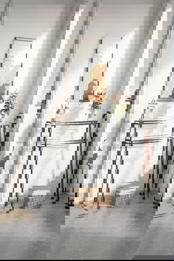 The sleek geometric line aligns perfectly with contemporary interior design aesthetics. The Livingandhome tempered glass console table is thoughtfully crafted to hold small essentials like keys, letters, and more. With its transparent tempered glass top and shelf, you can easily spot all your belongings, ensuring a swift grab when you are in a rush. The ample bottom space accommodates larger items, making the most of minimal space and helping you maintain an organized and efficient living area.