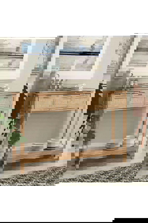 This Livingandhome exquisite console table features a blend of wood and rattan accents, creating a rustic and charming piece for your home. Crafted with a natural finish, this console features three spacious drawers with rattan weaving doors and an open bottom shelf, providing ample room to keep your belongings organized. Whether you place it in your living room, hallway, or bedroom, this console will provide both style and functionality.