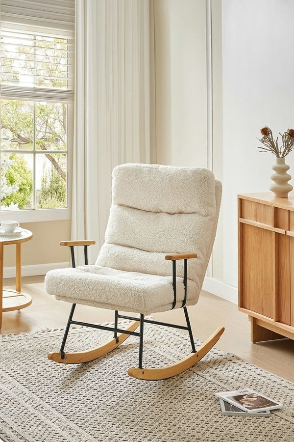 Wrapped in soft sherpa upholstery, this Livingandhome Adjustable Rocking Chair cocoons you in comfort. Supported by a robust wooden frame and iron base, its stability is unmatched. The reclining backrest caters to individual preferences, ensuring personalized comfort. Ideal for all ages, it is perfect for elders unwinding with a newspaper or mothers soothing their little ones to sleep. Experience unparalleled tranquility and comfort in every rock and sway.