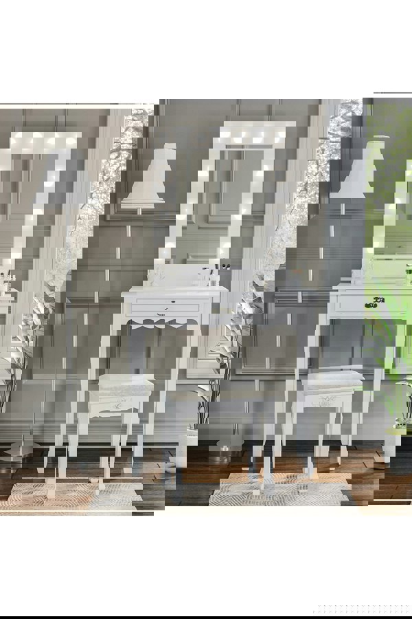 Upgrade your beauty routine and enhance your bedroom decor with the Livingandhome dressing table set. Its sleek and modern design features a stylish mirror and a convenient storage drawer, making it the perfect choice for any makeup enthusiast. The large storage drawer is perfect for storing all your makeup necessities, including brushes, palettes, and more, while the chic mirror is equipped with 10 bright LED bulbs that can be adjusted to three different colors (warm white, warm, and cool white), ensuring that you always look your best.