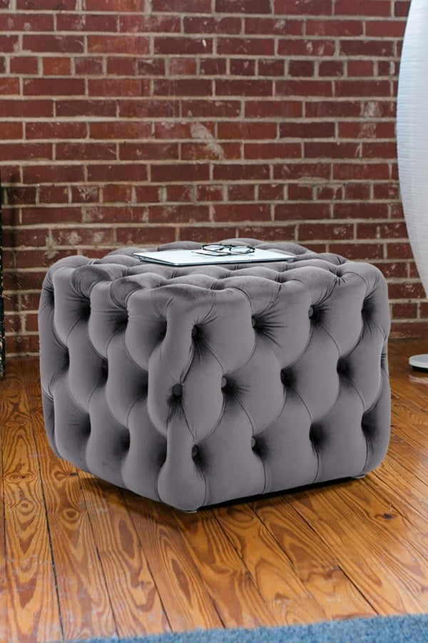 A refined finishing touch for the lounge, the Living and Home Velvet Upholstered Buttoned Footstool brings a considered vintage accent to your seating area. Velvet upholstery and deep buttoned detailing give it a tailored look, while the super-soft finish adds a cosy feel to the touch.