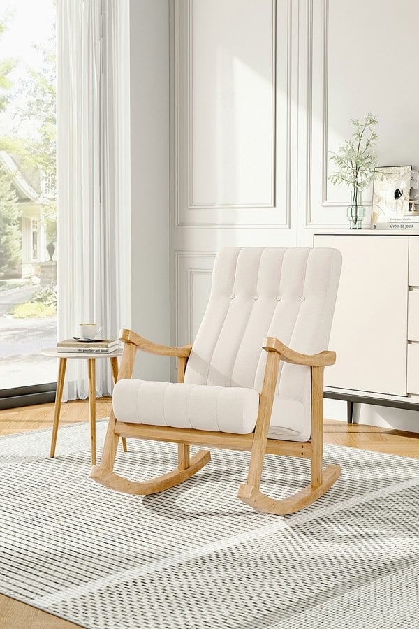 Built to bear casual style in mind, this Livingandhome rocking chair allows you to take a seat on it to spend the lazy afternoon. Featuring a sturdy rubberwood frame, you can feel relieved to rock on the chair while enjoying your cuppa or reading an unfinished novel. Thanks to its streamlined frame in a classic finish, the rocking chair does not look stuffy or stale. The tufted design goes perfectly with the velvety fabric, which is sure to turn heads in any space. This item requires assembly