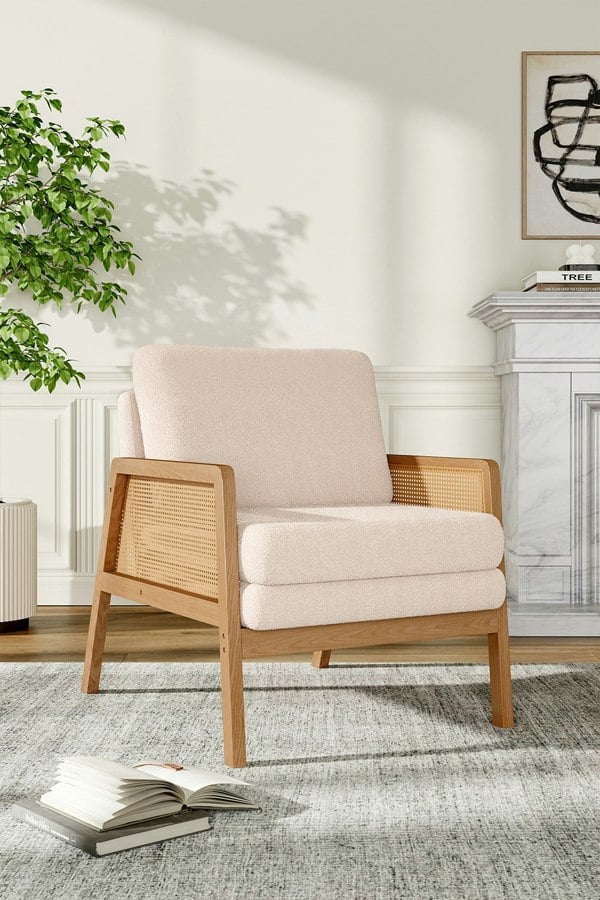 The wooden frame of this armchair features exquisite rattan work on the sides, giving it a warm feel that also adds to its rustic appeal