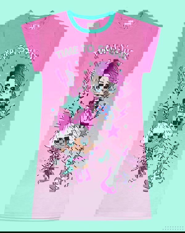 The pink and white crew neck dress has short sleeves and features the characters across the front with the slogan "Time to Shine."