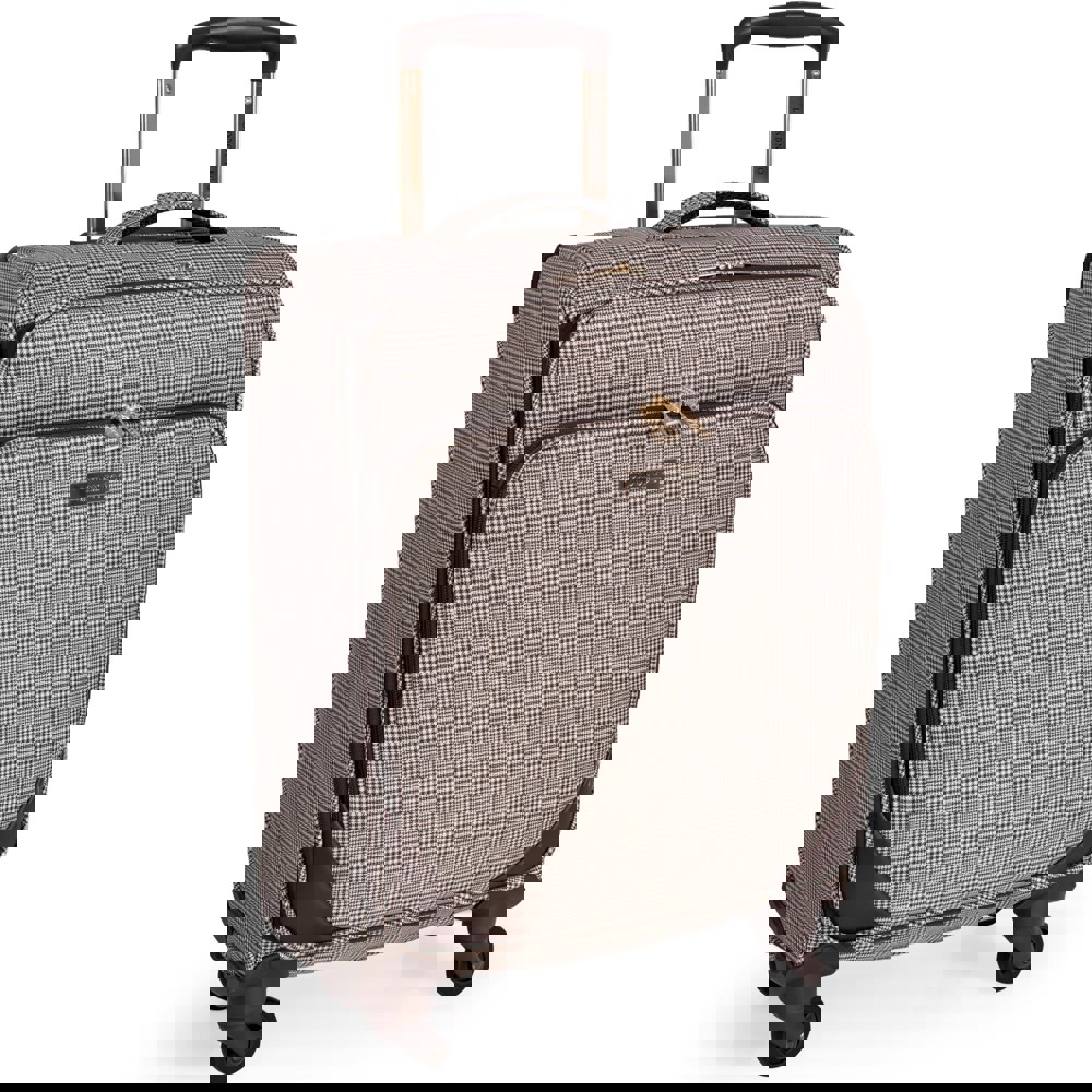 Featuring lightweight Prince of Wales plaid material, it includes a branded telescopic handle with a locking push button, ergonomic top carrying handles, and a fully branded interior with gold finish hardware