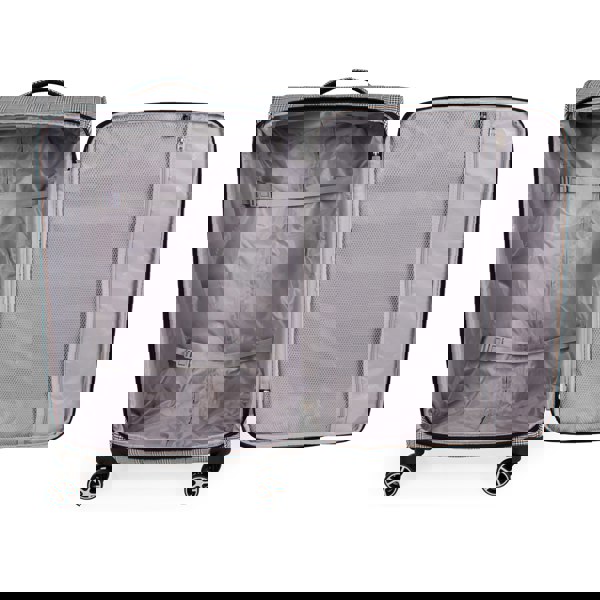 Featuring lightweight Prince of Wales plaid material, it includes a branded telescopic handle with a locking push button, ergonomic top carrying handles, and a fully branded interior with gold finish hardware