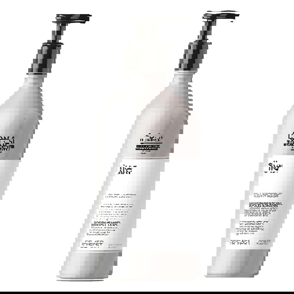 Show off your natural grey, white or light blonde hair with L'Oreal Professionnel Serie Expert Silver Shampoo; this toning purple shampoo neutralizes the hair.