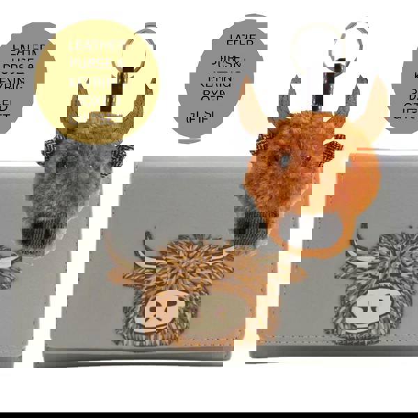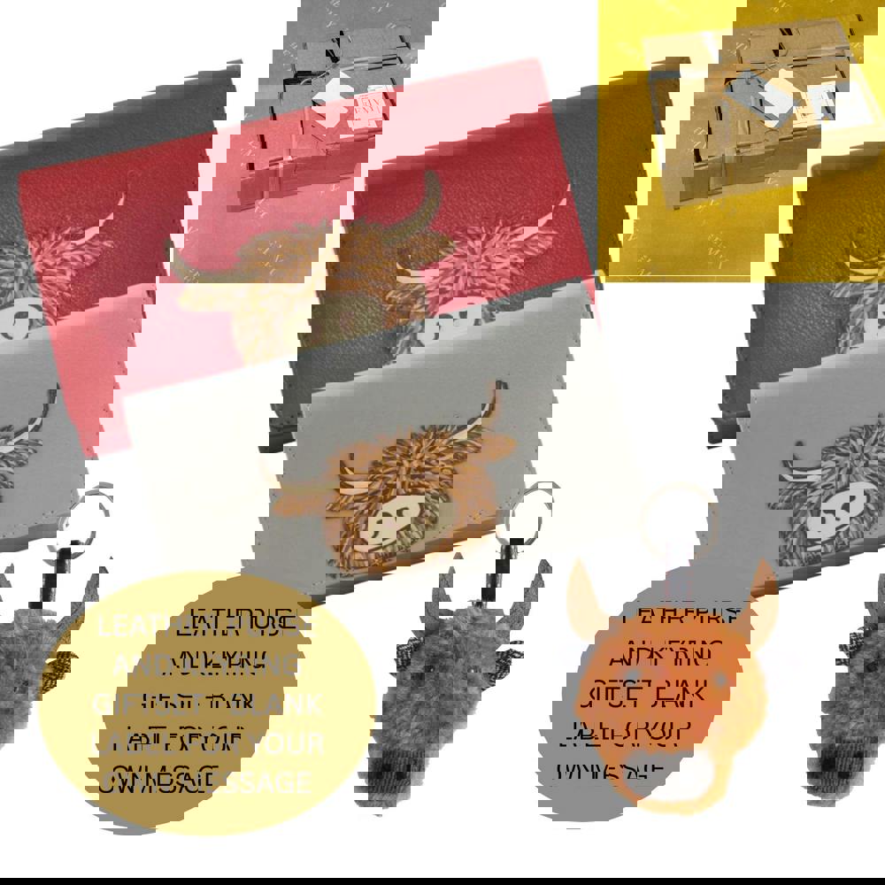 A beautifully presented leather gift set featuring a charming Highland Cow purse paired with a coordinating keyring. Thoughtfully gift boxed by Love EMVY Ltd with ribbon and a blank kraft gift tag, this elegant set is ready to give and ideal for a wide range of gifting occasions.