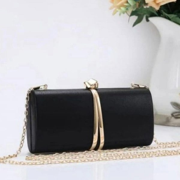 Add a touch of sophistication to your accessories collection with this sleek black evening clutch bag. Designed with a structured hard case silhouette and gold-tone trim, it is the perfect accessory for parties, weddings, and special occasions.