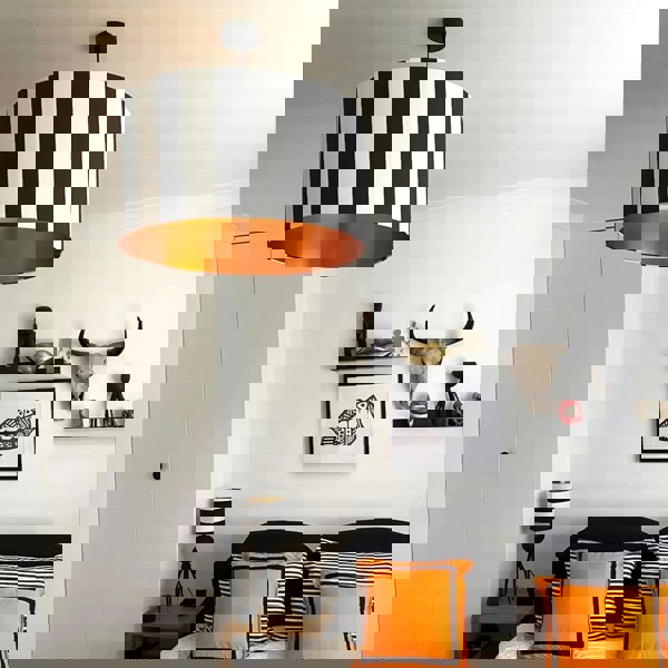 With its bold, contrasting vertical stripes in classic black and white, this lampshade is a true statement-maker. Paired with our rich, warming copper foil lining that adds a touch of luxury and elegance to any space.