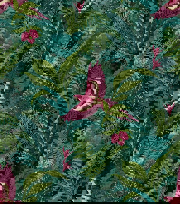 Our Bird of Paradise lampshades in rich luscious tones of green, teal and pink make up this fabulous jungle scene. Paired with our fabulous watermelon pink cotton, it highlights the pink of the soaring birds beautifully.