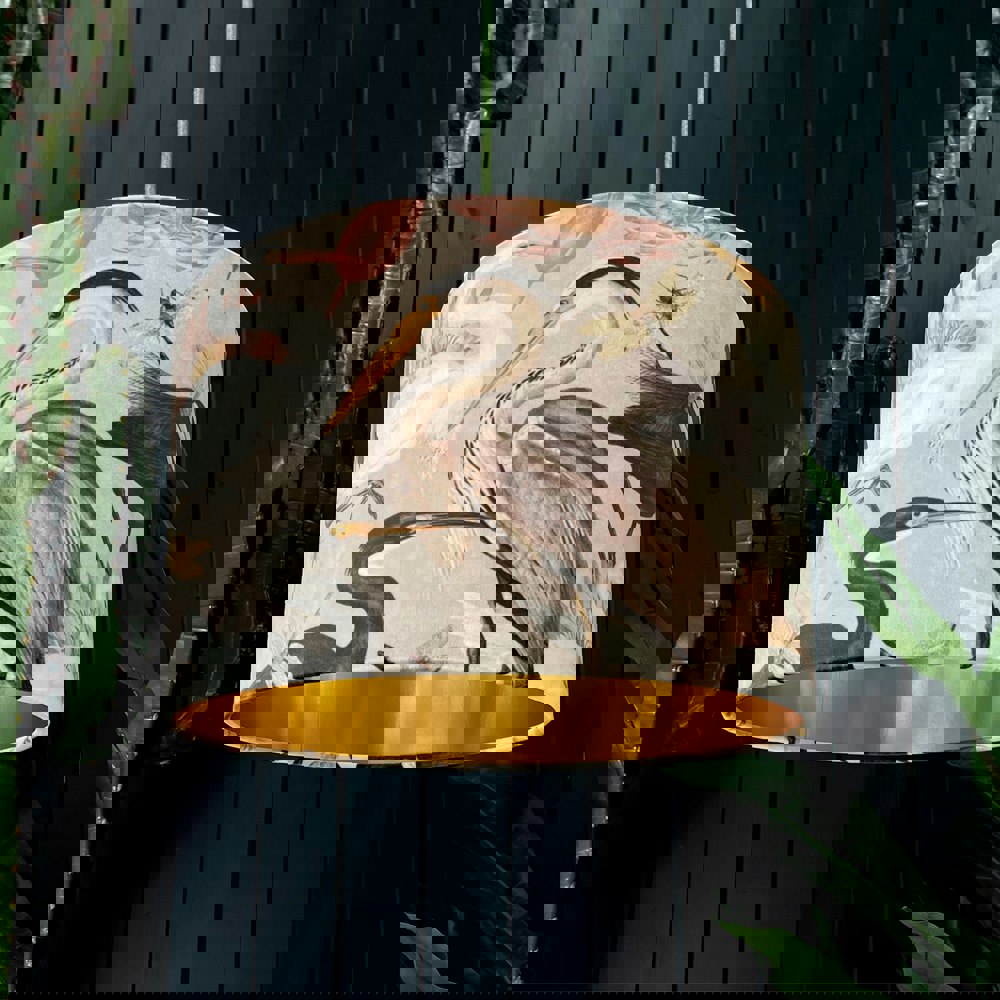 Flying in to steal everyones hearts is the tranquil Bird Song Lampshade in Bone with Gold Foil Lining. Showcasing a legion of beautiful Herons, dragonflies and lotus flowers. The magical world of the ANIMALESQUE is an extraordinary land of soft Velvet fabrics showcasing animal inspired designs with a focus on the flora & fauna and mythical birds & primates.