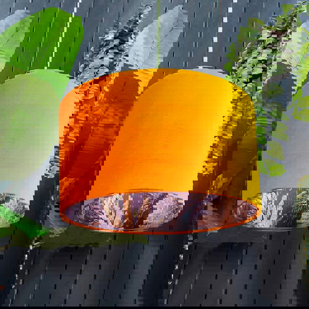 Enveloped in rich rust velvet, the exterior of this lampshade exudes warmth and comfort, while the interior showcases a stunning tropical forest scene. Lush plum purples and glorious olive greens create a mesmerising landscape, inviting you to lose yourself in the beauty of the natural world.