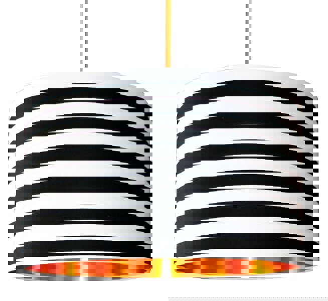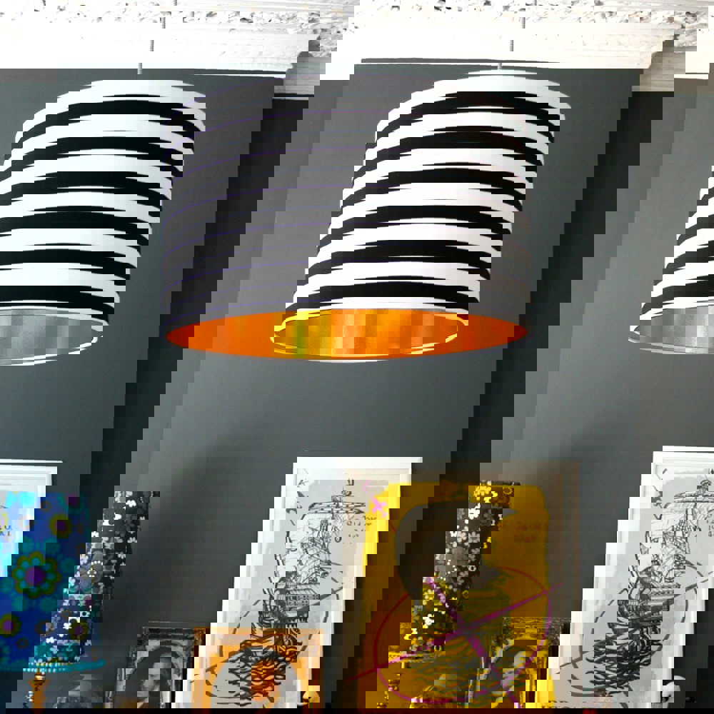 Prepare to be captivated by the bold and striking design of horizontal black and white stripes with our Circus Stripe Lampshades, Paired wonderfully here with our Copper foil lining, Our Circus stripe lampshades are not just accessories, they're statement pieces that demand attention.